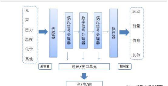 典型的 MEMS 系统如图所示,由传感器、信息处理单元、执行器和通讯/接口单元等组成。其输入是物理信号,通过传感器转换为电信号,经过信号处理(模拟的和/或数字的)后,由执行器与外界作用。每一个微系统可以采用数字或模拟信号(电、光、磁等物理量)与其它微系统进行通信。 MEMS 将电子系统与周围环境有机结合在一起,微传感器接收运动、光、热、声、磁等自然界信号,信号再被转换成电子系统能够识别、处理的电信号,部分 MEMS 器件可通过微执行器实现对外部介质的操作功能。