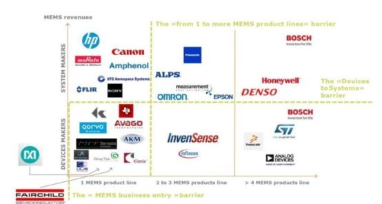 全球前十名 MEMS 厂商主要包括博世、意法半导体、惠普、德州仪器、佳能、InvenSense、 Avago 和 Qorvo、 楼氏电子、松下等等。 其中 BOSCH 因为其在汽车电子和消费电子的双重布局,牢牢占据着行业的第一的位置,其营收约占前五大公司合计营收的三分之一。