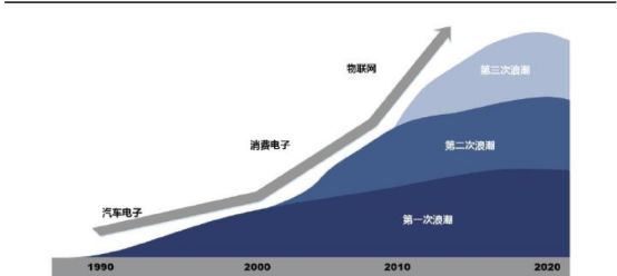 物联网产业覆盖面广,小到手机,大到新能源汽车以及大量未联网的设备、终端都将联通,为市场带来万亿市值增长潜力。互联网、智能手机的出世推动了信息产业第二波浪潮,但目前已趋于成熟,增速较为平缓,而以传感网、物联网为代表的信息获取或信息感知正在推动信息产业进入第三次浪潮,物联网时代已经启动。