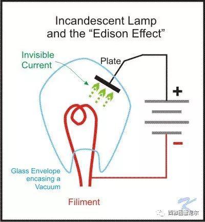 1883年,爱迪生正在为寻找电灯泡最佳灯丝材料,曾做过一个小小的实验。结果,他发现了一个奇怪的现象:金属片虽然没有与灯丝接触,但如果在它们之间加上电压,灯丝就会产生一股电流,射向附近的金属片。