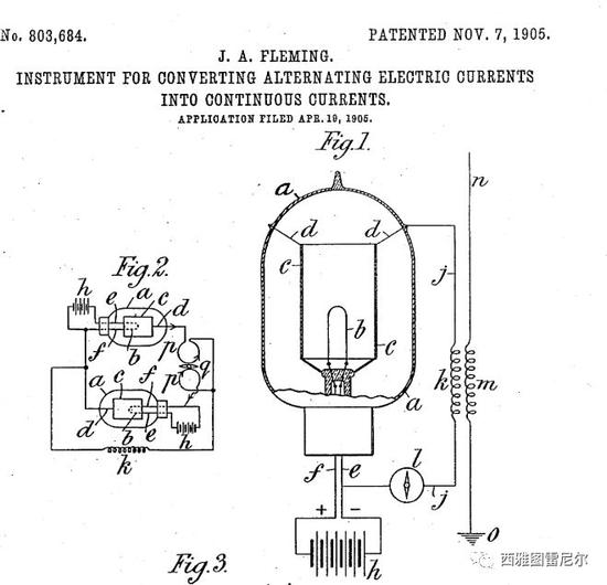 1904年弗莱明利用爱迪生效应搞出来的第一个二极管(Diode),并获得了专利。这个二极管干可以用来做无线电电报的检波器。二极管这个东西在实验室中很好,但是一到实际应用场合就不很稳定。