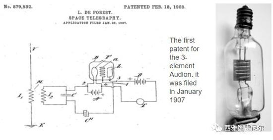 1906年美国发明家,Lee de Forest (这个人故事很多)在二极管的灯丝之间巧妙加了一个栅板,从而发明了第一个真空电子三极管。 (grid Audion) 用于检波放大。我估计Lee打死也没有想到他这个发明的意义。