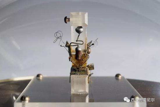 1947年12月15日,这种实验结出了硕果:他们用刀片在三角形金箔上划出了两道极细的缝隙,然后两边分别接上导线,用弹簧将其压进锗块表面。这是一个由锗、电池、金线、弹簧、纸板、组成的小装置。连好线后,当锗块上的两个接触点越来越近时,他们观察到了电压放大作用:1.3v电压被放大了15倍!