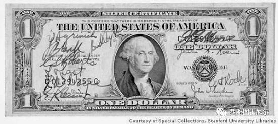 两个银行家被打动了,Coyle说,我没有准备协议书,拍出10张一美元的纸币,哥们,要入伙的,在上面签字。仙童八叛将与两位银行家在1美元纸币上签了名字。