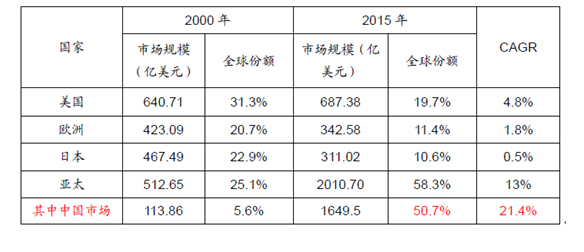 从2000年开始,中国半导体市场的增速开始不断提振。数据显示,在2000年到2015年的16年里中国半导体市场增速领跑全球达到21.4%,而同期全球半导体年均增速是3.6%,美国近5%,欧洲和日本都较低,亚太较高为13%。中国半导体市场份额从约5%提升到50%以上,已经成为全球最大、所有业者必争的核心市场。不过,仍需要认识到的是,放眼全球市场,国内半导体企业的竞争力和创新能力与国外仍有一定差距,同时国内的产业链也亟需进一步完善。