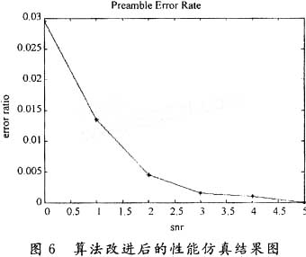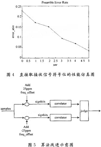 对上述检测方法做一点改进,首先对接收信号进行调制,分别将接收信号的调制到25 ppm和-25 ppm,然后分别将这两路信号,用上述方法分别检测,只要有一路检测达到标准,即可判定接收信号的帧头是这种类型的帧头,电路结构见图3。检测的错误率如图6所示,可以看出,经过这样的改进后,判定的错误率大大减小。