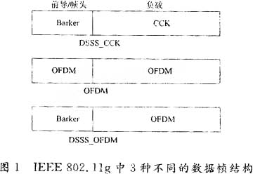 在IEEE 802.11g标准中,其帧头可以采用两种形式中的一种:正交频分复用(OFDM)类型和直接序列扩频(DSSS)类型。