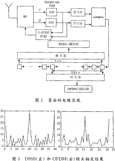两种preamble周期的不同可以用来区分他们,为了提高检测的可靠性,可以用好几个周期。用4μs之内的采样值会比较方便,因为正好包含了4个DSSS preamble周期,5个OFDM preamble周期。因此,延迟线结构的4μs之内的采样值相关并将相关值与设定的门限做比较就构成了一个非常有效的区分两种不同preamble的算法。
