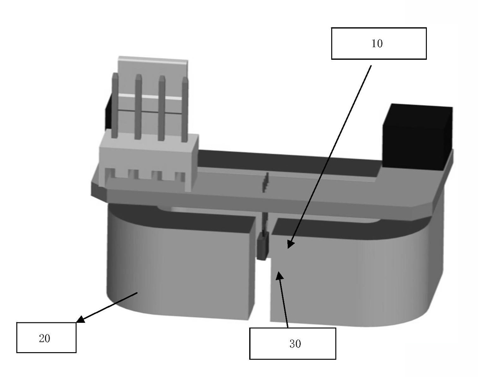 现有技术中存在的缺点是,上述的测试方法通过人工操作进行测试,可能会产生误差,导致准确性非常差。具体而言,当霍尔芯片所在位置处于磁芯气隙中磁场强度最强的位置时,可以粗略地反应出电流传感器的静态输出,并不能准确的检测出霍尔芯片是否被压弯。当霍尔芯片所在的位置并不是处于磁芯气隙中磁场强度最强的位置时,霍尔芯片两侧的磁场不平衡,所以电流传感器的静态输出超出范围。因此,当霍尔芯片所在的位置并不是处于磁芯气隙中磁场强度最强的位置时,现有的测试方法并不适用,无法准确地检测霍尔芯片是否被压弯。