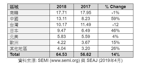 率而言,中国大陆从82.3亿元弹升至131.1亿元,年增59%为最高,其次为日本,自64.9亿元增加到94.7亿元,较2017年增长46%,第3是以东南亚为主的其他地区,年增26%;欧洲年增15%,名列第4。值得一提的是,台湾半导体设备销售金额自114.9亿元下滑至101.7亿元,年减12%,衰退最多,而韩国虽保持最大市场,但比前一年度却略减1%,衰退幅度次于中国台湾。