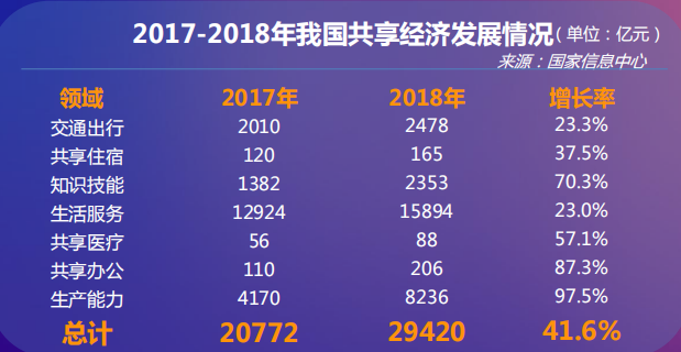 根据国家信息中心的报告显示,2018年共享经济市场交易额为29420亿元,比上年增长41.6%。