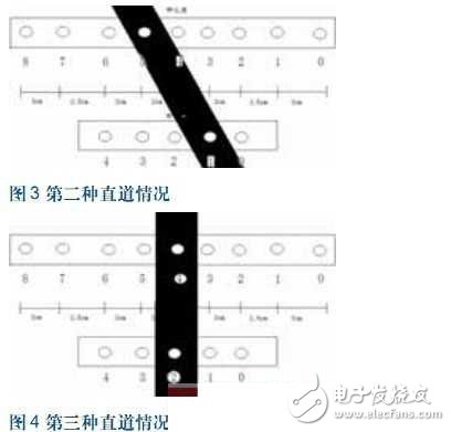 进入弯道后,随着小车的行进,会发生振荡,致使出弯时不一定满足上述5种情况。为了提高直道的识别成功率,增加第二种直道判别方法。两者同时起作用,满足第一种后经过最多15ms确认是直道。