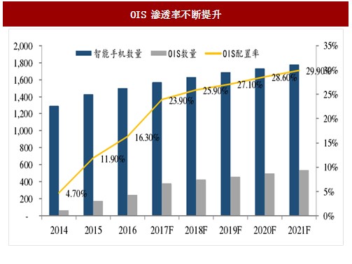 OIS(光学防抖)是 VCM 的重要功能,由于 OIS 的存在,摄像头允许的快门速度可以更慢,这样曝光时间更长,进光量就能更多,从而在暗光环境下的图像更加清晰,因此这一功能在不断提高。2018 年,华为正在增加具备 OIS 功能的机型,oppo 和 vivo 也是如此。