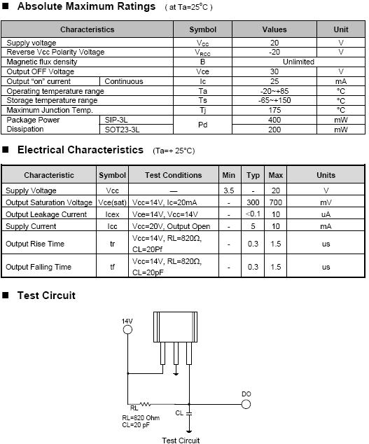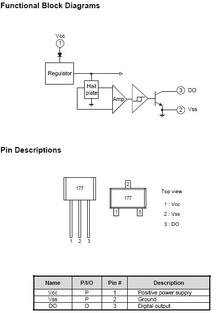 ATS177系列双极锁存霍尔效应集成传感器:是由一个稳压电源,霍尔电压发生器,差分放大器,施密特触发器和输出放大器组成的磁敏传感电路。