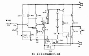 图1为一个由分立元件构成的直流化的互补对称OCL电路。电路由差分放大级、电压推动级和复合输出级构成。本电路引入了直流负反馈电路,一般功放中由于存在反馈电容,限制了低频响应,为了消除这种不利影响,只有增大反馈电容,但电容较大,会使电路不稳定。该电路取消了反馈电容,彻底解决了这一矛盾。同时,通过射级电阻引入本级负反馈,明显改善了本级性能并简化了电路。输出级工作在