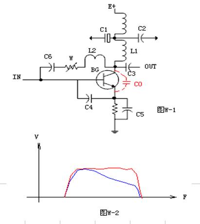 在高频状态下工作的晶体管有以下特点:1、由于制造工艺的原因,在高频工作状态下晶体管的β值不能做得很高,工作频率每增加一倍,β值就减少6db。2、在高频状态下管子的引线电感不可忽略,它对放大器工作频段的高端增益有严重的影响。3、晶体管的输出电容(结电容)在高频状态下也是一个不可忽略的参数,它对放大器工作频段的高端增益也具有严重的影响。 为此,在高频工作状态下的晶体管放大电路必须要对工作频段的高端进行补偿。图W-1是一宽带高频放大器的典型工作电路,L1是BG的负载,如果它选择适当,它和警惕管内的输出电容C0组成并联谐振回路,且使得它的谐振频率在工作频段的高端,这样在频率的高端区的增益将会得到提升。 在高频状态下,管子的各引线脚相当于一个电感,加入电容C4,这个电容和基极--射极之间的引线电感并联组成一个并联谐振电路,且也使它谐振于频段的高端,这样也使工作频段的高端增益得到了提升,另外,由于它属于输入回路,所以调节C4可改变放大器的高端增益和匹配。 在此放大器中L2、W、C6组成了一个负反馈电路,在频率的低端,L2呈现较低的阻抗,而在频率的高端它呈现较高的阻抗,这样一来就相对地提高了工作频段高端的增益。调整W可改变中间频段的增益,改善放大器的平坦度。 C5是一个高频提升电容,此电容的容量较小,它对高端频段的信号阻抗小,从而减少了放大器的电流负反馈量,提高了高端的增益。