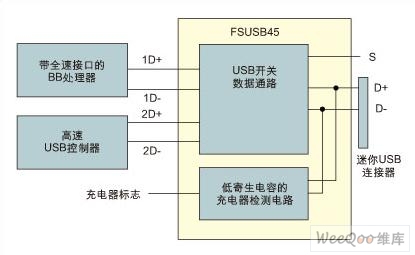 图2:带充电器检测功能的USB开关非常适合高速USB应用,其USB电源和数据端口是共享的。