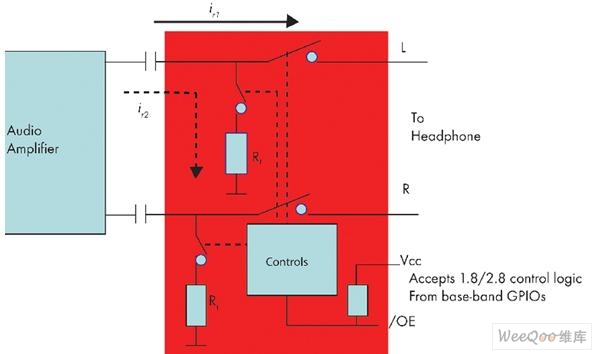 图1显示了另一种方法,这种方法在音频信号通路中增加了一个独立充电通路,从而允许交流耦合电容器在被切换至耳机或主通路前被完全充电。这可借助基带处理器的通用I/O进行控制,让音频放大器和开关先上电,主信道开关此时处于关闭状态。音频输出的共模电压将开始从0升至VCC/2。一段时间后(以10ms为参考),耦合电容器两端被充电至等电位,这时再开启主信道就完全不会有浪涌电流了,因为此时电容器两极之间的压差为0V。