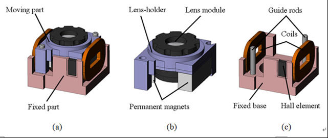 此驱动器可分为移动部件与固定部件两大部分。如图b所示,移动部件包括镜头模组Lens、镜头座Holder以及两个永磁铁Magnets;而固定部件如图c所示,包括一个霍尔元件(Hall element HG106C/HG166A)、两个线圈Coils、两根与固定座垂直的导杆Rods。