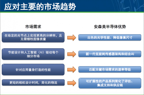 应对汽车、消费和工业市场中图像感知领域挑战的关键是提供一系列规格和性能能够准确匹配、并紧跟终端应用广泛差异需求的器件。安森美半导体图像传感器在汽车、工业、航空、医疗领域的市占称冠全球,公司传承40多年先进的成像技术,提供宽广的CMOS和CCD图像传感器阵容。未来,安森美半导体将持续注重中国,通过遍及全球的评估及应用技术支持,持续开发针对市场趋势和应用的新产品。此外,那些由安森美半导体推出的基于平台的方案提供便利的可扩展性,大幅简化且加速设计路径。