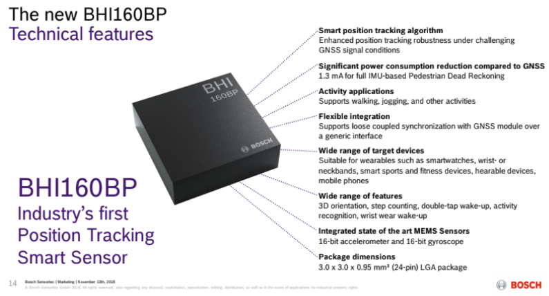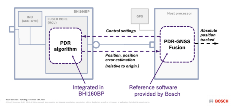 这种传感器的独特之处在于GPS是在GPS位置报告之间循环的占空比功率,其他惯性传感器使用行人航位推算(PDR)算法对当前位置进行插值。这种组合降低了“始终开启”位置跟踪系统的功率要求,同时保持了近绝对定位。博世表示,与永远在线的GPS传感器相比,它的功耗降低了80%。该传感器在GPS跟踪通常在室内和室外都可能发生故障的环境中也是可靠的。