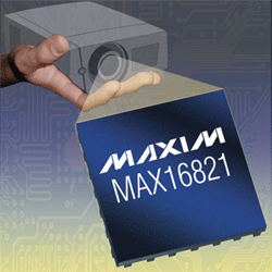 Additional features include programmable hiccup, overvoltage protection, reverse-current limit, and an output-enable function. For systems requiring multiple drivers, the part also features a clock output with 180 phase delay that can control a second, out-of-phase LED driver. Housed in a 28-pin TQFN package with an exposed pad, the MAX16821 also features a unique pin configuration capability that allows the device to be operated in either synchronous buck or synchronous boost mode.