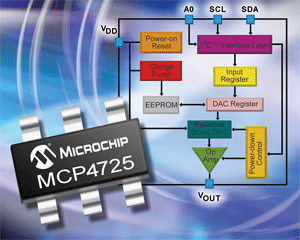 The 12-bit MCP4725 D/A converter with EEPROM comes in a 6-pin SOT-23 package. Features include a power consumption of 0.06 μA in shutdown and an onboard precision output amplifier.