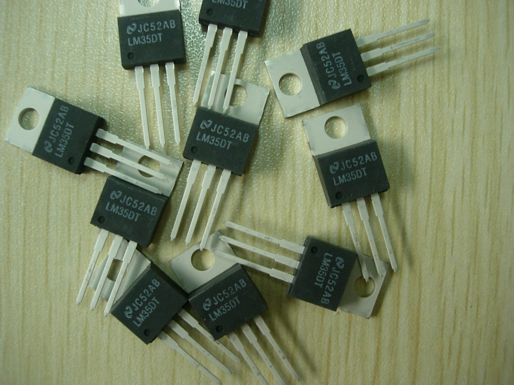 The LM35 series are precision integrated-circuit temperature sensors, whose output voltage is linearly proportional to the Celsius (Centigrade) temperature. The LM35 thus has an advantage over linear temperature sensors calibrated in ° Kelvin, as the user is not required to subtract a large constant voltage from its output to obtain convenient Centigrade scaling. The LM35 does not require any external calibration or trimming to provide typical accuracies of ±¼°C at room temperature and ±¾°C over a full -55 to +150°C temperature range. Low cost is assured by trimming and calibration at the wafer level. The LM35's low output impedance, linear output, and precise inherent calibration make interfacing to readout or control circuitry especially easy. It can be used with single power supplies, or with plus and minus supplies. As it draws only 60 µA from its supply, it has very low self-heating, less than 0.1°C in still air. The LM35 is rated to operate over a -55° to +150°C temperature range, while the LM35C is rated for a -40° to +110°C range (-10° with improved accuracy). The LM35 series is available packaged in hermetic TO-46 transistor packages, while the LM35C, LM35CA, and LM35D are also available in the plastic TO-92 transistor package. The LM35D is also available in an 8-lead surface mount small outline package and a plastic TO-220 package.