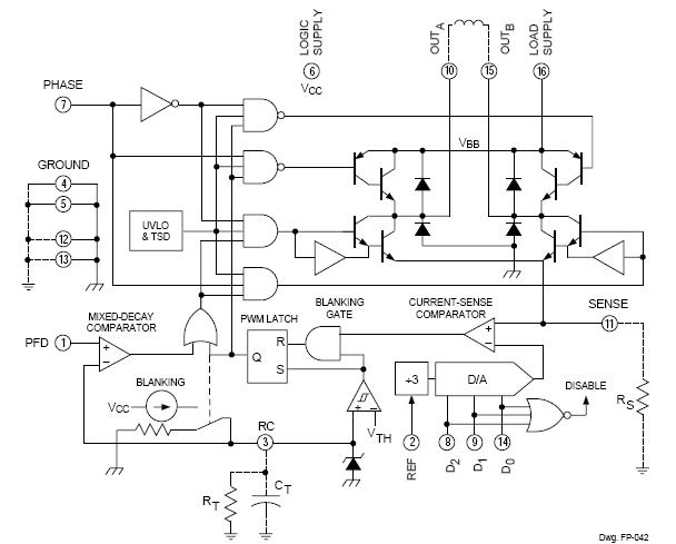 A3955SB-T主要特性及应用:最大1.5A的最大驱动电流,最高50V的供电电压,带有过热自动关断保护电路,欠电压锁定(UVLO)保护,输出抗浪涌的瞬间保护功能,自带PWM 电流控制,3位的线性DAC,带细分控制,不同组合不同的细分数,最多8细分。