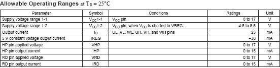 When this IC is operated from an externally supplied 5 V power supply (4.5 to 5.5 V), short the VCCpin to the VREG pin and connect them to the external power supply. When this IC is operated from an externally supplied 12 V power supply (8 to 17 V), connect the VCCpin to the power supply. (The VREG pin will generate a 5 V level to function as the control circuit power supply.)