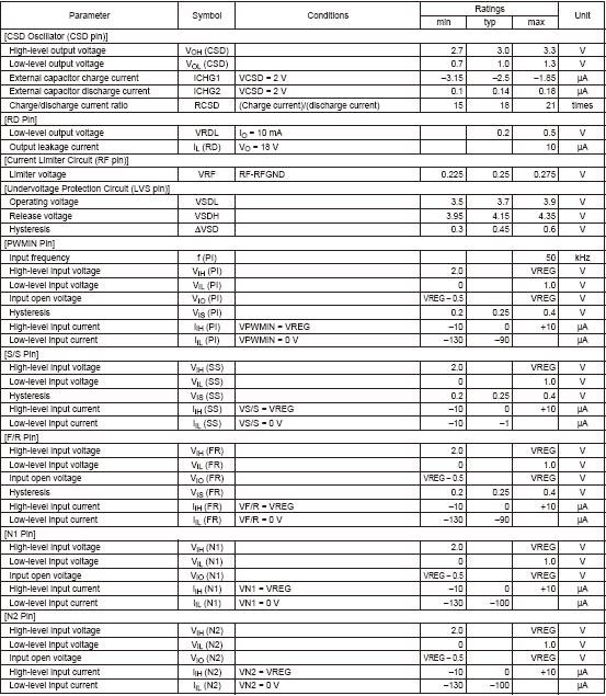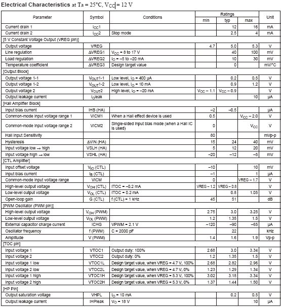 When a 0.47 µF capacitor is connected externally to the CSD pin, this iterated operation will have a drive on period of about 0.38 seconds and a drive off period of about 6.7 seconds. While the motor is turning, the discharge pulse signal (generated once for each Hall input period) that is created by combining the Hall inputs internally in the IC discharges the CSD pin external capacitor. Since the CSD pin voltage does not rise, the constraint protection circuit does not operate.