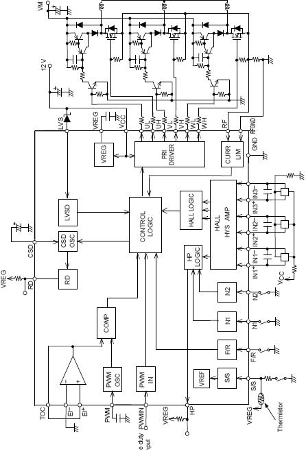 A signal input with an amplitude in excess of the hysteresis (80 mV maximum) is required for the Hall inputs. Considering the possibility of noise and phase displacement, an even larger amplitude is desirable. If disruptions to the output waveforms (during phase switching) or to the HP output (Hall signal output) occur due to noise, this must be prevented by inserting capacitors across the inputs. The constraint protection circuit uses the Hall inputs to discriminate the motor constraint state. Although the circuit is designed to tolerate a certain amount of noise, care is required when using the constraint protection circuit. If all three phases of the Hall input signal system go to the same input state, the outputs are all set to the off state (the UL, VL, WL, UH, VH, and WH outputs all go to the low level). If the outputs from a Hall IC are used, fixing one side of the inputs (either the + or – side) at a voltage within the common-mode input voltage range allows the other input side to be used as an input over the 0 V to VCCrange.