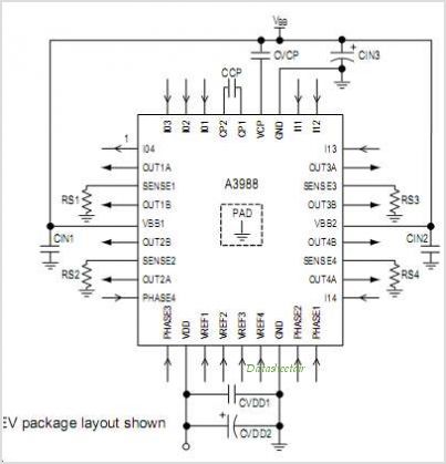A3988 采用 EV 和 JP 两种封装,并带有用于增强热性能的外露功率片。EV 采用 0.90 毫米标称总体封装高度的 6 毫米 x 6 毫米、36 引脚 QFN 封装。JP 是 7 毫米 × 7 毫米 48 引脚 LQFP。两种封装都为无铅封装,采用 100% 雾锡电镀引脚框。