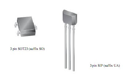 Features and Benefits – Wide operating voltage range from 2.5V to 24V – Medium sensitivity – CMOS technology – Chopper-stabilized amplifier stage Superior temperature stability Extremely low switchpoint dr Insensitive to physical stress – Low current consumption – Open drain output – Tiny SOT23 3L and flat SIP 3L both RoHS Compliant packages