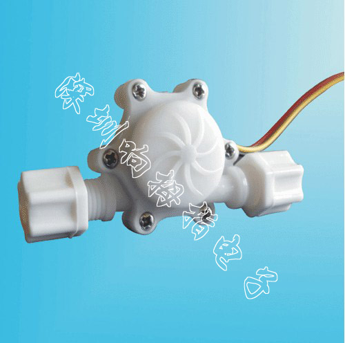 水流量传感器主要由塑料阀体 、水流转子组件和霍尔传感器组成。它装在测量设备进水端,用于检测进水流量,当水通过水流转子组件时,磁性转子转动并且转速随着流量变化而变化,霍尔传感器输出相应脉冲信号,反馈给控制器,由控制器判断水流量的大小,进行调控