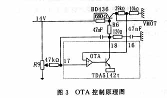 前者是在额定电压下通过改变最佳换相时刻,而直接改变电机的换相频率fc,进而改变电机的转速n;后者是通过改变驱动输出级的电源电压VMOT而实现无级调速,图3为OTA控制电路原理图。此电路属典型的模拟分压电路,所有的三极管均工作在放大状态,R6和680Ω电阻为三极管BD436提供基极电流,对于不同的三极管,R6的取值应不同,但最重要的是保证BD436工作在线性放大状态。实验时,TDA5142T的17脚电压若与VMOT电压之比为1∶5时,则说明工作正常,否则R6选取不当。