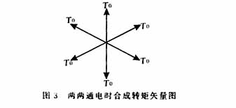。在两两换相的情况下,每隔60°电角度换向1次,每个功率管通电120°,每个绕组通电240°,其中正向通电和反向通电各120°,其合成转矩的矢量图为图3,转矩波形见图4,从图4可知转矩波动为0.87∶1,每相绕组的平均转矩为: