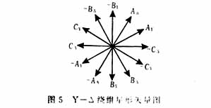 Y-Δ混合连接绕组是把普通的60°相带三相绕组分成两套三相绕组,这两套绕组之间在空间相位上彼此相差30°电角度,其中一套采用Δ接法,一套采用Y接法,即把原60°相带分为两个30°相带,分别放置两套绕组,其磁势星形矢量图为图5,两套绕组串联连接如图6所示。