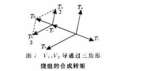 由于在三相全控两两通电方式中,每瞬间有2个功率管通电,每隔60°换相一次,每次有一个功率管换向,每个功率管导通120°,即当功率管V1和V2导通时,电流从V1流入星形绕组的A相,流过三角形绕组时,分别通过C相绕组和A、B两相串联的绕组,再从星形绕组的C相绕组V2管流出,这时星形绕组产生的合成转矩矢量同图2,考虑三角形绕组中的电流方向,产生的合成转矩矢量为图7。