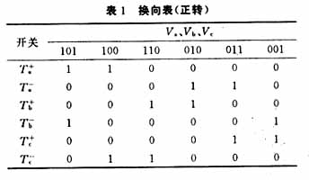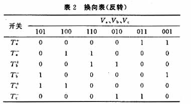 换向子程序的主要功能是,根据正、反转命令和反电势逻辑电平状态确定出相应的功率管开关状态。其框图如图6所示。在中断子程序中CPU首先读入a、b、c三相的反电势逻辑信号,然后判断电机的正反转状态(依据主程序中的正反转标志),根据正、反转状态和三相反电势逻辑状态信号查表确定逆变器的开关状态。正、反转状态下,反电势逻辑状态信号和开关状态之间的对应关系如表1、表2所示,它们以表格的形式存入EPROM中。
