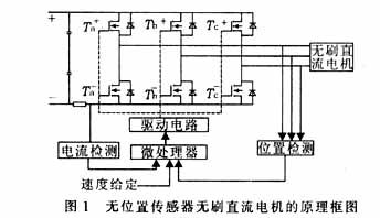 无位置传感器控制无刷直流电机的系统原理框图如图1所示,电机工作于三相6拍工作方式,采用电压外环、电流内环的双闭环控制,逆变器功率管以PWM调制方式工作,控制器以MC8031为核心。