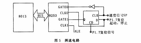 图5为测速电路,8253的计数器0和计数器2都工作在方式2状态。其中,计数器0对来自CD4046的倍频脉冲SP进行计数,计数器2对来自8031ALE引脚的高频时钟脉冲fc进行计数。D触发器74LS74用来使高频时钟脉冲的计数与倍频脉冲SP同步。由于8253为负沿计数,故加入反相器74LS04。8031的P1.6端给出起动和测速信号。CPU采用M/T法适时计算出电机的转速。