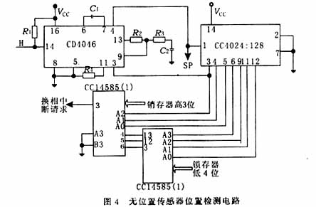 从图2可知,反电势信号Ea、Eb、Ec经过零比较器后,得到反电势逻辑电平信号Va、Vb、Vc,三路逻辑电平信号Va、Vb、Vc分别经图3所示的脉冲倍频器后相或,得H脉冲列,这样一个反电势周期对应6个H脉冲。相邻H脉冲上跳沿的中点便是理想换向点。图4为无位置传感器位置检测电路,图中锁相环CD4046和2进制串行计数/分频器CC4024构成128倍频电路,SP为倍频信号。相邻两个H脉冲上跳沿之间被128倍频,则当计数器CC4024计数值为64时便对应最佳换向时刻。由两片并行数字比较器CC14585构成的8位数字比较器时刻将计数器的计数值与锁存器的输出值进行比较,锁存器为8031系统扩展的一个外设端口,主要存储换相角γ对应的计数值,若将数值64存入锁存器,则每当计数器CC4024计数值为64时,数字比较器CC14585(1)的3引脚便发出一个脉冲,此脉冲作为换向中断请求信号向CPU请求中断,调用换向子程序,实现电机绕组电流的换向。