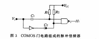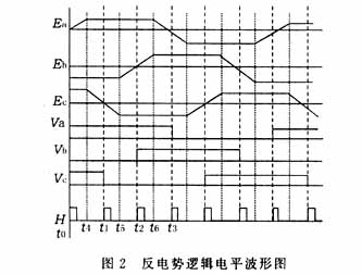 电机运行时,检测非导通相的反电势过零点,利用过零比较器将反电势信号Ea、Eb、Ec分别转换为逻辑电平信号Va、Vb、Vc如图2所示。采用CMOS门电路组成的脉冲倍频器如图3所示,将Va、Vb、Vc倍频后相或,得一脉冲信号H,如图2所示,此时H脉冲列周期为60°电角度,从图2中可看出t0时刻恰好a相反电势向上过零,应延时30°电角度即在t0、t1时刻的中点t4时刻开通