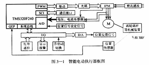基于TMS320F240数字信号处理芯片、智能功率模块IPM、无刷直流电动机的智能电动执行器的驱动系统具有以下主要特点:控制电路简单、软件代替硬件、开发速度快、系统运行平稳。