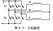 系统采用的控制方式为二相导通三相六状态,主电路如图3—2所示。功率器件的排列顺序采用图中所示的上桥臂1,3,5,下桥臂,4,6,2的顺序。按照一定的逻辑关系打开6个功率器件,即可实现电机的正反转。根据磁极位置传感器的信号组合,有6种状态,一一对应于桥臂的开关组合,如从T1,T2→T2,T3→T4,T5→T5,T6→T6,T1→T1,T2,如此循环,反过来即可实现反转。