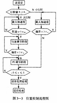 图3—3给出了其中的位置控制流程。在偏差较大的时候,采用能快速纠偏的非线性控制作为开始的粗定位。为了保证精度,在位置偏差进入较小范围内的时候,控制器由非线性控制换成线性控制,从而保证了位置控制的快速性和精确性。