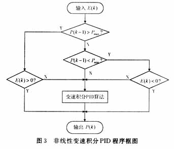 非线性变速积分的PID算法的基本思想是将PID调节器输出限定在有效的范围内,避免P(k)超出执行机构动作范围而产生饱和。程序的框图如图3所示。