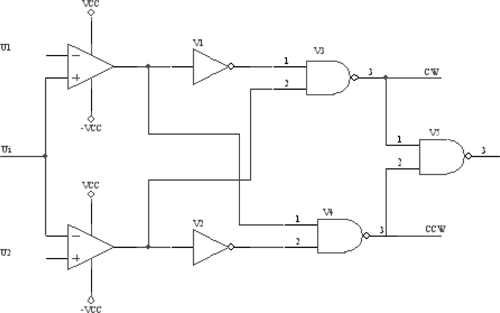 窗口比较电路为步进电机提供方向控制信号和步进电机的起停控制信号,电路如图6所示。其中,U1、U2为数控等离子切割机弧压的上、下限电压,Ui为检测到的弧压。当Ui>U1,V3输出为高电平,V4输出为低电平,V5输出为高电平;当U2<Ui<U1,V3和V4输出均为高电平,V5输出为低电平;当Ui<U2,V3输出为低电平,V4输出为高电平,V5输出为高电平。将V3输出或V4输出作为步进电机的方向控制信号,V5作为步进电机的起停控制信号。脉冲控制信号由LM331输出信号提供。