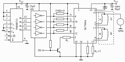 用PMM8713步进电机环形分配器与SI7300A步进电机功率放大器设计了一个四相步进电机功率驱动电路,PMM8713采取单脉冲输入、1-2相励磁方式,电路如图5所示。图中PD控制端为SI7300A的输入电流I0调节端,可悬空或接高电平,接高电平时可适当提高SI7300A的输出电流I0,在本应用系统中悬空使用。图中PMM8713的时钟脉冲输入信号由LM331(V/F)输出,方向控制信号和步进电机的起停信号由窗口比较电路给出。